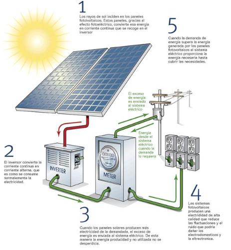 los Paneles Solares a la Red Eléctrica Publica. La Energía que consume el cliente proviene de la Red Pública. Los Paneles Solares se conectan a un Inversor Solar de Inyección (On Grid). En este sistema, nunca se consume de forma directa la Energía Producida por los Paneles Solares. Con este Sistema, la Distribuidora Eléctrica a la cual pertenezca el cliente, le colocara un Medidor Bidireccional, que Sincronizara software con el Inversor Solar. Este Medidor, por un lado contabilizara la Energía Eléctrica producida por los Paneles Solares y que inyectara a la Red Pública, y del otro lado contabilizara la Energía Eléctrica que el cliente consume en su casa o negocio. Normalmente, si el cliente coloca el 100% de los Kwp (Kilowatt de Potencia) de su consumo en Paneles Solares sobre su techo, el Recibo de la Factura Eléctrica debería llegar a “Cero” pesos. Con este Sistema, si la Energía Eléctrica se va en la Red Pública, al cliente también se le cortara la Energía Eléctrica.